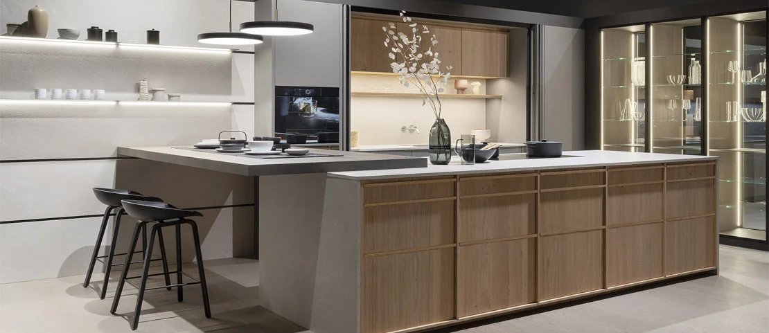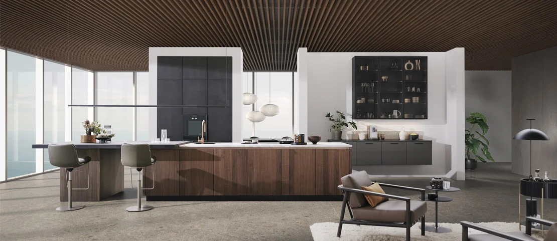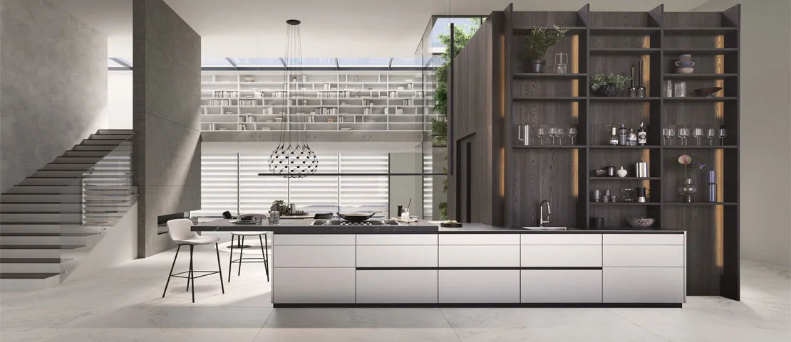 Cette palette unique, allant des tons sobres aux nuances plus intenses, offre d'infinies possibilités de personnalisation, créant une harmonie entre la cuisine et la pièce de vie. Les finitions disponibles, mates ou brillantes, ainsi que les éléments d’ameublement comme les poignées, valorisent les lignes architecturales.